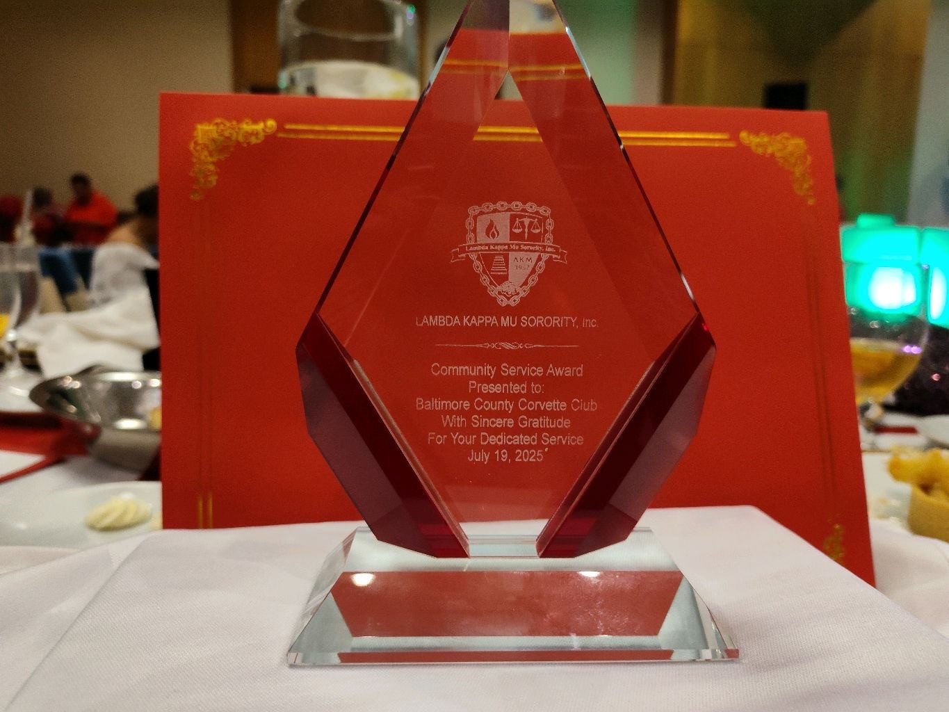 On July 19th, the Baltimore County Corvette Club, Inc. was awarded the Community Service Award. The award was presented by the Lambda Kappa Mu Professional Women. The award was in recognition of our 20 years of giving back to and serving communities in Baltimore & the surrounding Metropolitan areas. Thank you to the Lambda Kappa Mu professionals for recognizing our contributions to the community.